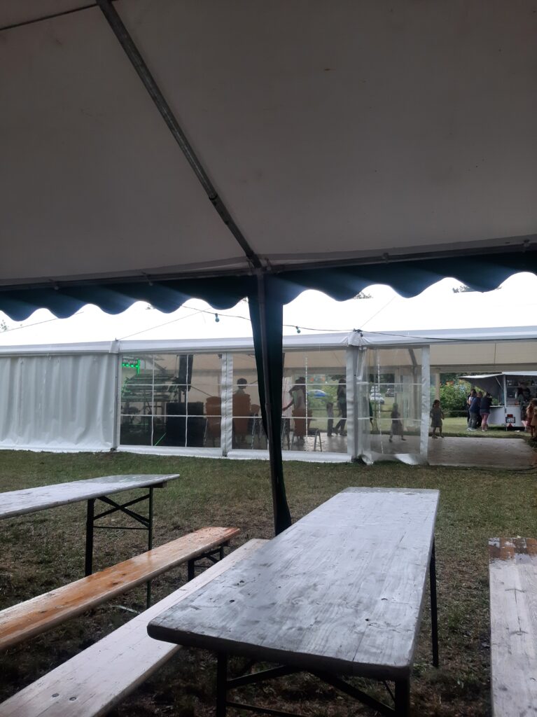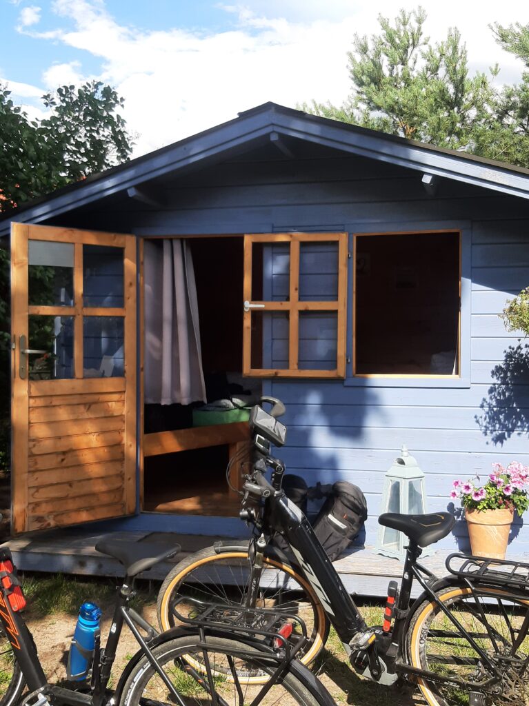Dort angekommen bezogen wir unsere einfache, spartanische Hütte und erfuhren, es gab dort heute ein Hafenfest. Da riesige graue Wolken aufzogen, fuhren wir, die Satteltaschen abgeladen, gleich dorthin, um etwas Essbares zu bekommen. Es gab dort nämlich weder Geschäfte noch Gasthäuser, die geöffnet waren. Beim Fest angekommen ging ein riesiges Gewitter nieder. Aber wir saßen im Zelt, aßen gemütlich und als das Gewitter vorüber war, fuhren wir in unser Quartier! Schön war das Hafenfest in Kratzeburg!😄