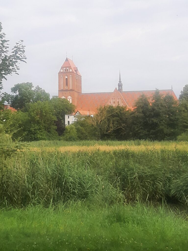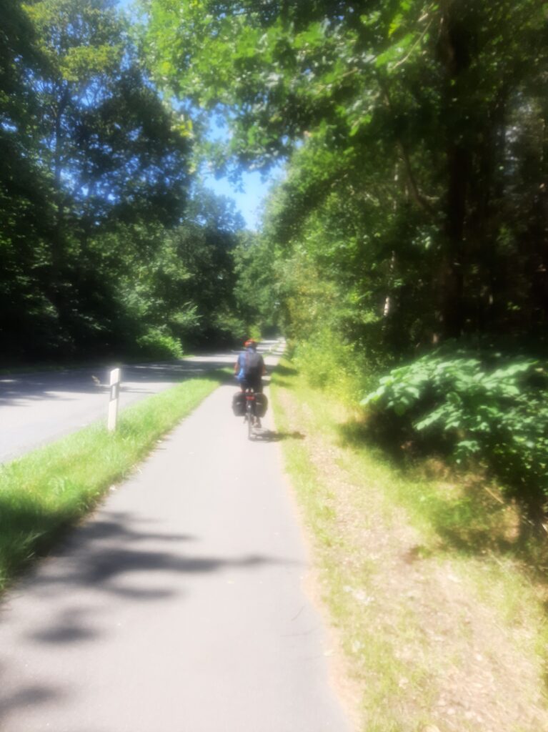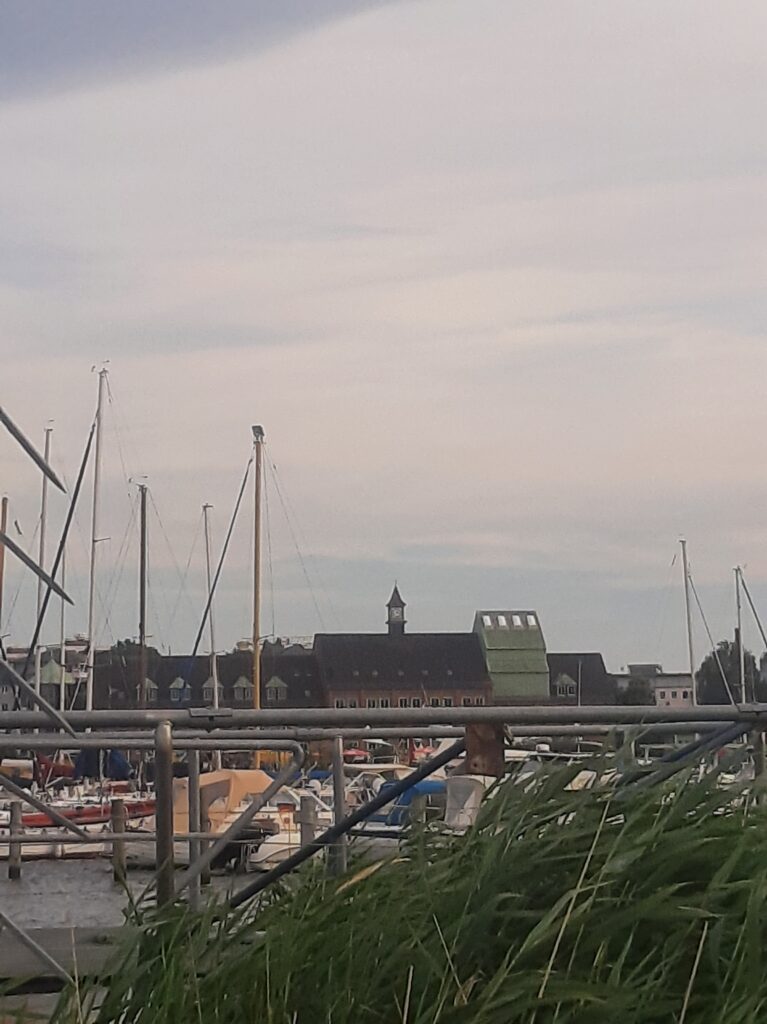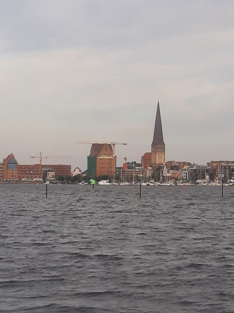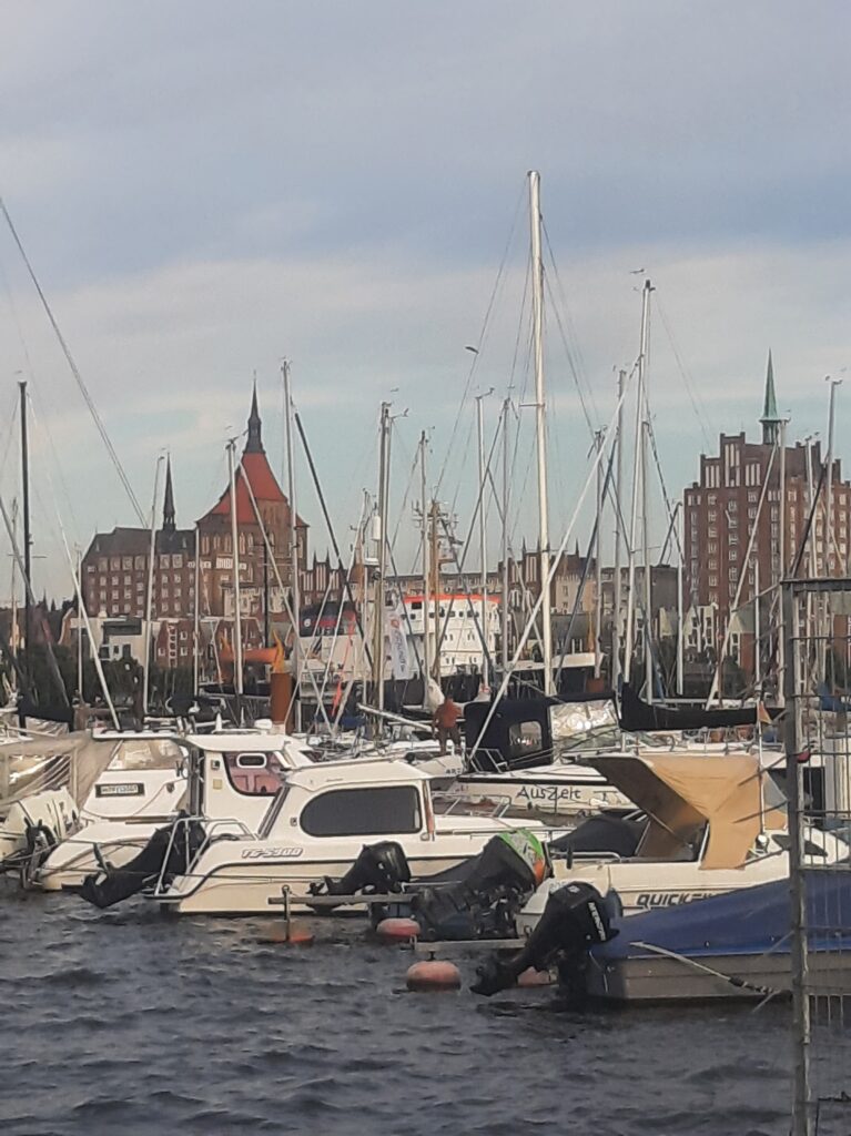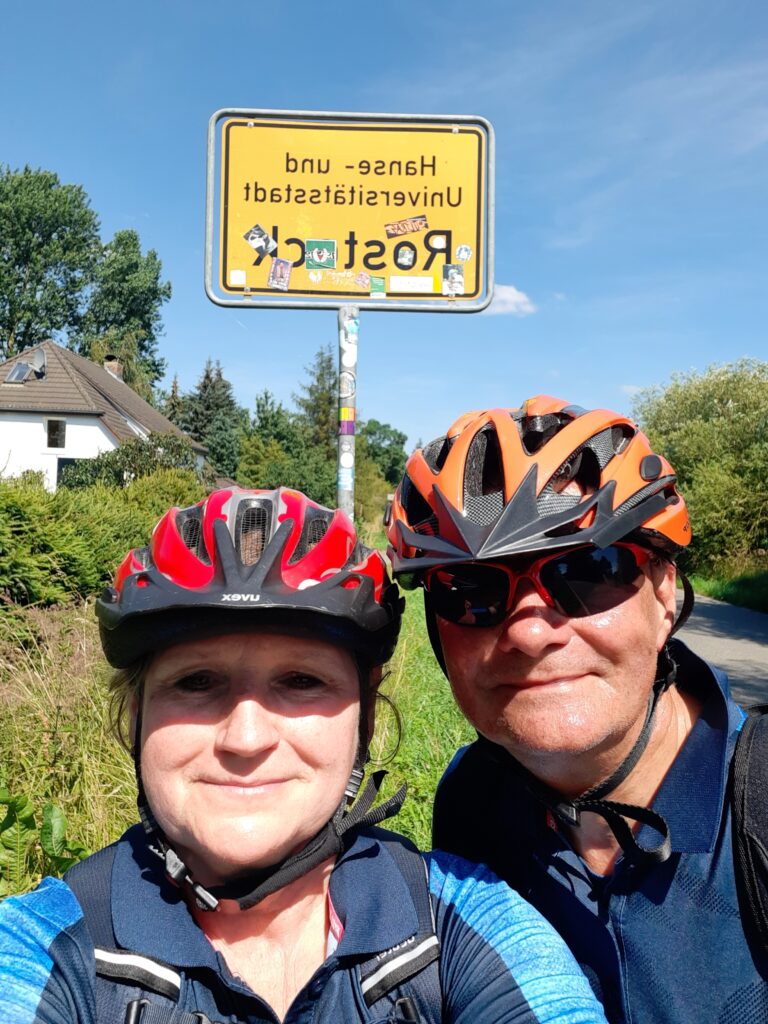 Dann gings in flottem Tempo weiter. 40 km bis Schwaan. Dort pausierten wir etwas länger. Dann waren noch 20km bis Rostock, unserem heutigen Ziel, angeschrieben. Wir freuten uns sehr, die Ortstafel zu sehen! Dann lasen wir weiter-Rostock/Überseehafen -15 km! 🥺 Das war etwas ernüchternd, denn es wurde uns klar: Rostock ist groß! Wir mussten dorthin, um unsere Fährtickets für die morgige Überfahrt zu sichern!