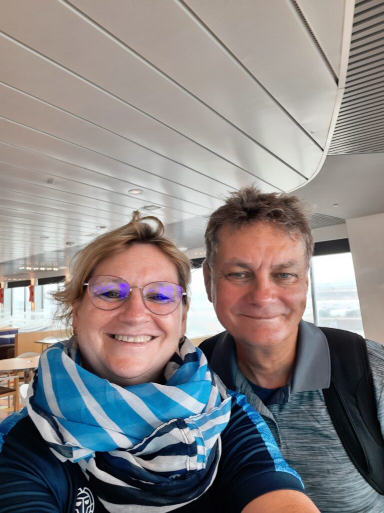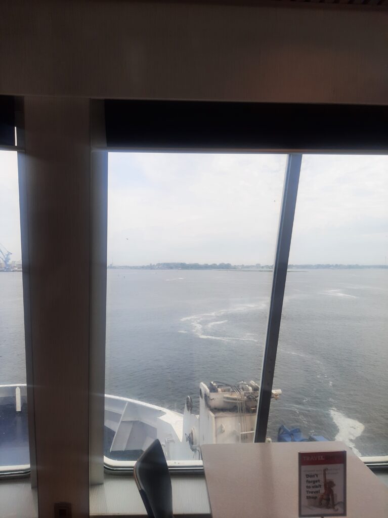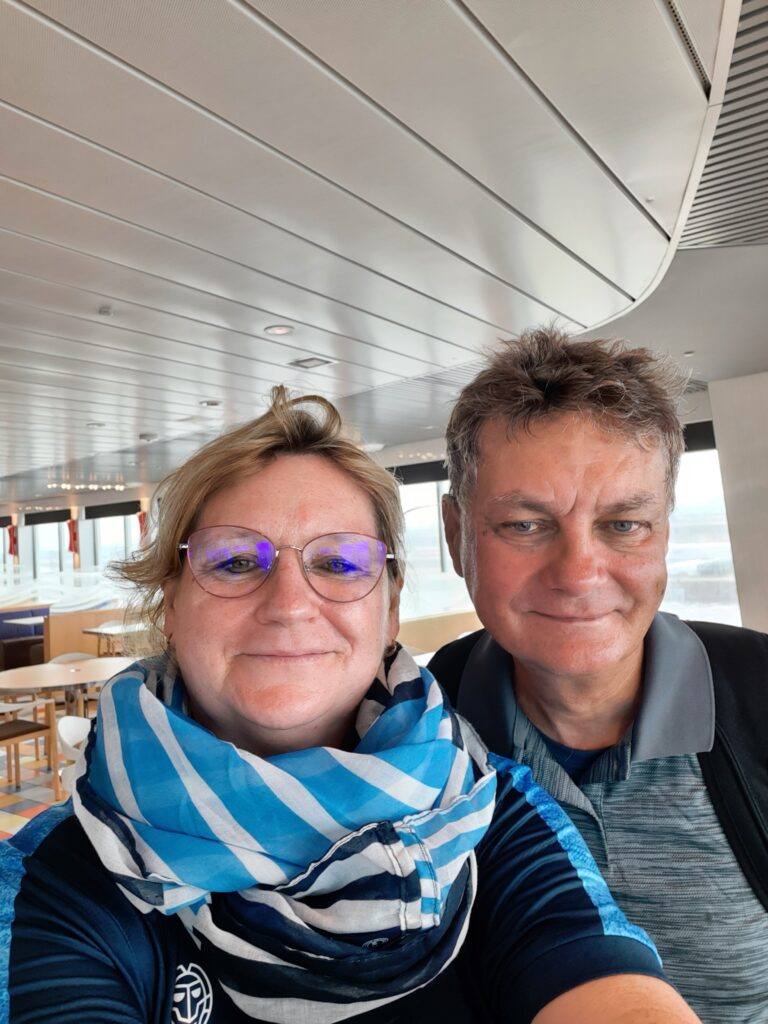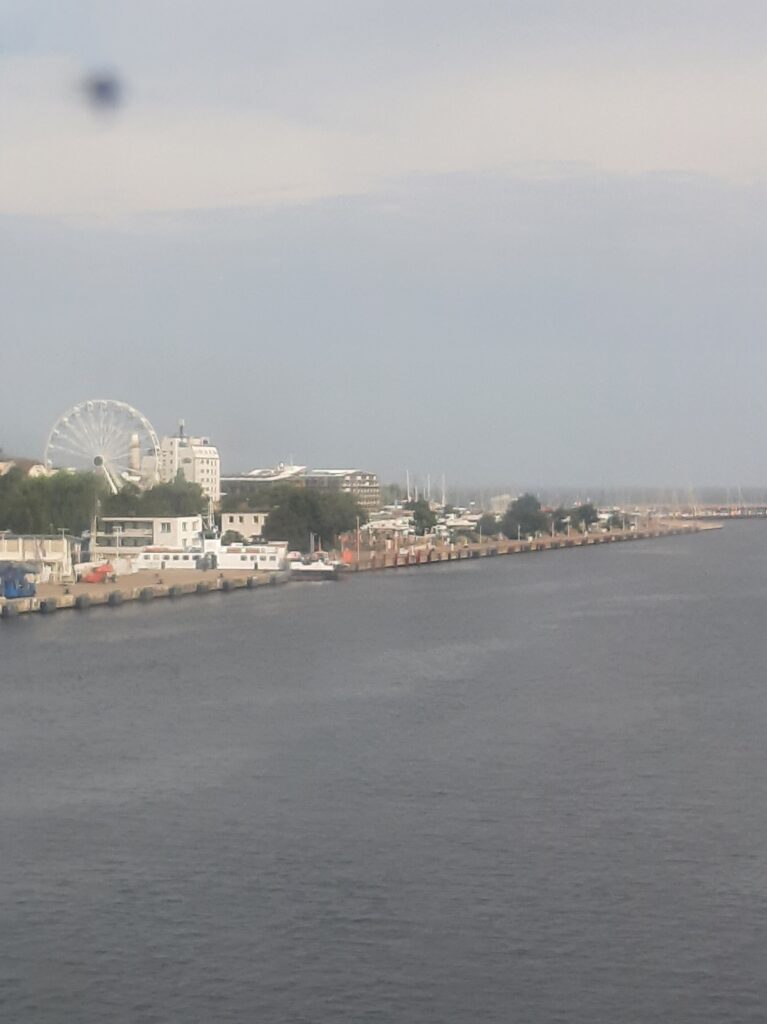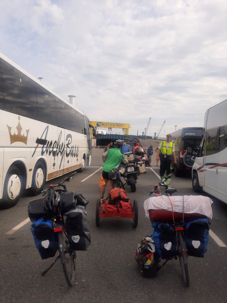 Heute in der Früh sollte es um 7.45 Uhr mit dem Rad zum Überseehafen Rostock gehen. Leider hat meine Morgenroutine unter argwöhnischen Blicken Karls zu lange gedauert und wir starteten erst um 8.00 Uhr. Dem entsprechend legte Karl bei der Fahrt ein Tempo vor. Das Navi sagte uns, wir brauchen für die 8 km 28 Minuten, wir fuhren mit 25 bis 30km/h durch Rostock und schafften es in 18 Minuten. Aber wir kamen rechtzeitig auf die Fähre und durften dort bei der zweistündigen Fahrt frühstücken und etwas entspannen.
