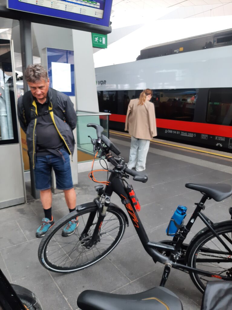 Wir brachen von zuhause, einem Ort ca 20km westlich von Wien mit unseren beiden Rädern, bepackt mit unseren 2 prall gefüllten Satteltaschen, auf. Das Abenteuer begann bereits auf dem Bahnhof Hütteldorf, wo wir den Bahnsteig wechseln mussten, leider aber mit unseren Rädern nicht in den Fahrstuhl passten und das Rad die Stufen hinauf zum Bahnsteig tragen mussten. In Wien Hauptbahnhof spielte uns die ÖBB noch zweimal einen Streich und kündigte den falschen Bahnsteig an, was bei allen Reisenden kurzfristig ziemlich große Hektik hervorrief.