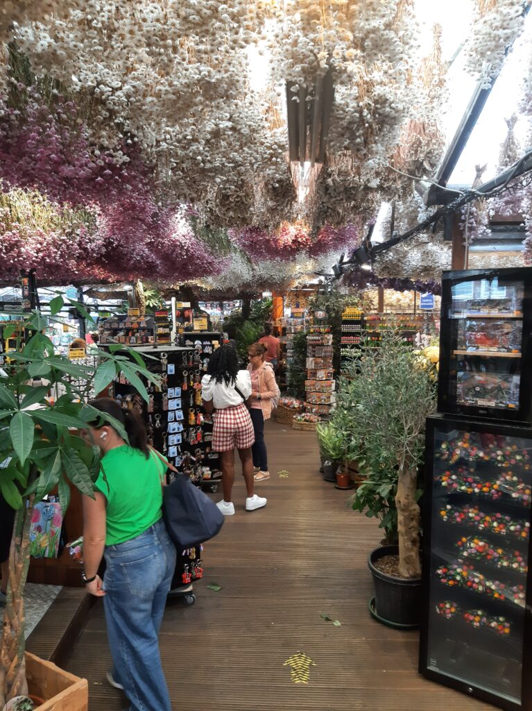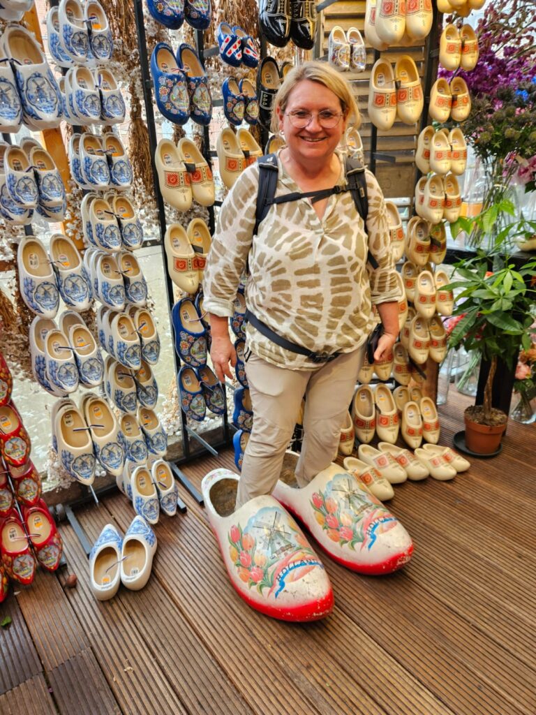 Anschließend machen wir uns auf den Weg zum Amsterdamer Blumenmarkt, der viele verschiedene Blumen, Blumenzwiebeln und Wurzelstöcke feilbietet (auch die Holzschuhe der Holländer) und wo man sich vorkommt wie in Wien am Naschmarkt. Das Besondere ist, die Läden sind auf Hausbooten auf den Grachten erbaut.