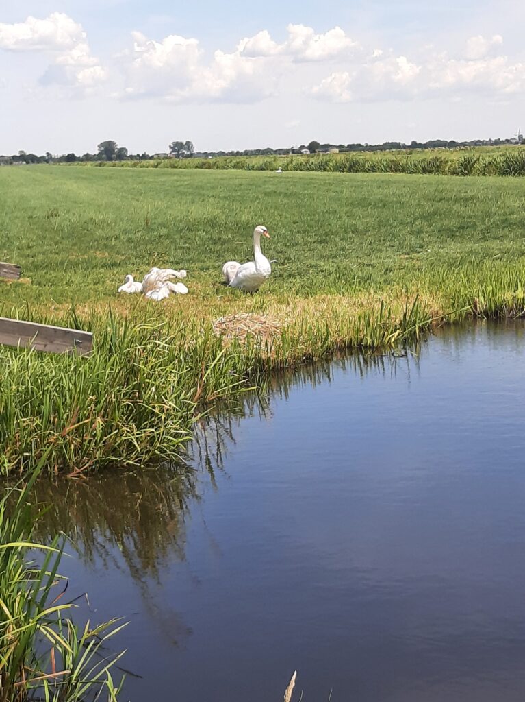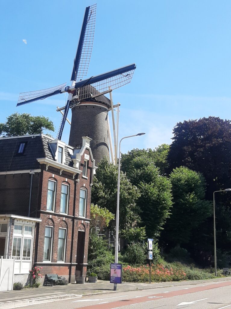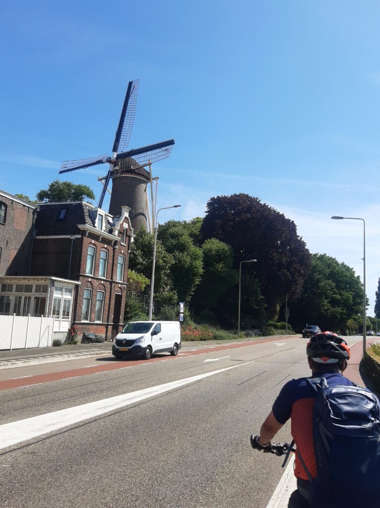 Der Vormittag führt uns weiter durch Süd-Holland mit seinen vielen Kanälen, Windmühlen und malerischen Landschaften, wo man unzählige Reiher, Schwäne, Enten aller Art und viele andere Tiere beobachten kann. Es wird uns bewusst, dass Holland zwar ein sehr flaches Land ist, teilweise unter dem Meeresspiegel, jedoch die Windmühlen nicht umsonst schon vor hunderten von Jahren gebaut wurden. Gegenwind ist unser Endgegner. Wir strampeln und radeln, um gegen den Wind anzukommen, das ist doch Recht anstrengend! Am Nachmittag wird es noch windiger und zusätzlich kommen noch drei von mir gefürchtete ziemlich lange und hohe Brücken dazu, die bei diesem Wind wirklich eine Herausforderung für mich sind. Geschafft, wenn auch mit schlotternden Knien, geht es weiter, vorbei an den Gewächshäusern vom – gefühlt- gesamten Holland-Blumenmarkt nach Dremmelen, unserem nächsten Quartier.