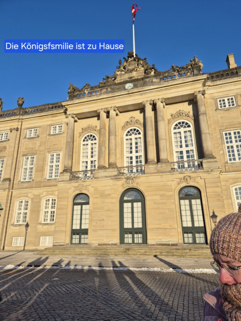 Dann ging es durch die Stadt: Nyhaven, Schloss Amalienburg, Gotteshäuser sämtlicher christlicher Kirchen, eine Synagoge, die Oper, Staatsbibliothek, der Wohnsitz der Königsfamilie samt Wachen der Konigin-Witwe (wie die Dänen sie nennen), die neuen Wohnviertel Kopenhagens und schließlich zum Abschluss die ‚Kleine Meerjungfrau‘.